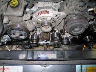 ボンネットを開けてEG助手席側のタイベルカバーを確認するとオイルが滲んでいるのが確認できる。白い矢印がタイミングベルトカバーで丁度カムシャフトプーリー。オレンジ色のい矢印は、タイベルカバーを止めるボルトでその部分がオイル漏れから黒々と光っている。オレンジの矢印が乗っている配管はラヂのLowホース。